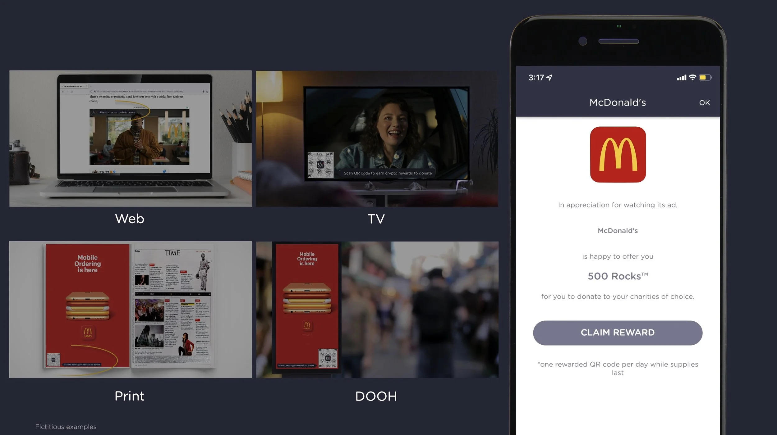 Boost the performance of your social ads, online display and video ads***, TV commercials, DOOH ads or print ads by rewarding consumers financially with crypto called Rocks™ whenever they see (impressions), watch entirely (completed views), or click on your WhatRocks-labeled ads.