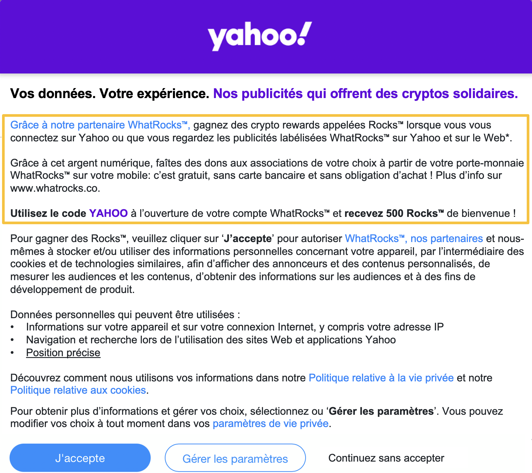 Profitez de votre fenêtre de consentement pour proposer à votre audience d’être récompensé financièrement grâce aux publicités que vous diffusez : s’ils donnent leur consentement au suivi publicitaire, ils seront davantage ciblés par les publicités labélisées WhatRocks qui les récompensent avec des crypto rewards appelées Rocks™ dont ils pourront faire don aux causes qui leur tiennent à coeur.
