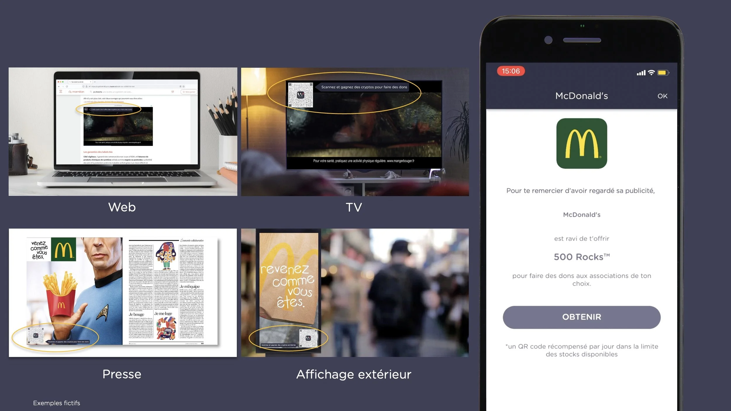 Dopez la performance de vos publicités social media, online (en display ou vidéo), TV/OTT/CTV, DOOH ou print en récompensant financièrement les consommateurs avec des cryptos appelés Rocks™ lorsqu’ils voient (impressions), lorsqu’ils regardent entièrement (complétions vidéo), ou lorsqu’ils cliquent sur vos publicités labélisées WhatRocks sur Internet.